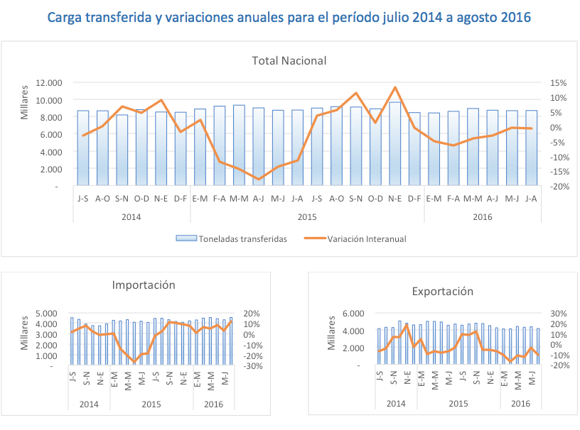 En el trimestre móvil finalizado en agosto de 2016 se movilizó un promedio mensual de 8.694.977 toneladas de carga de comercio exterior a través de los puertos chilenos, lo cual presenta una disminución de un 1% respecto del mismo período del año anterior.