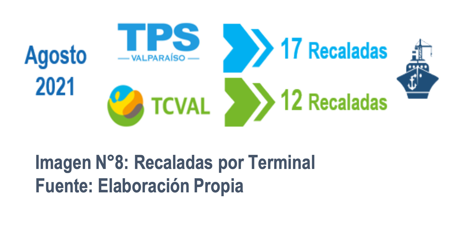 En específico, TPS atendió 17 naves (8 naves menos que agosto 2020) y en TCVAL se mantiene sin variaciones con 12 recaladas para ambos periodos.