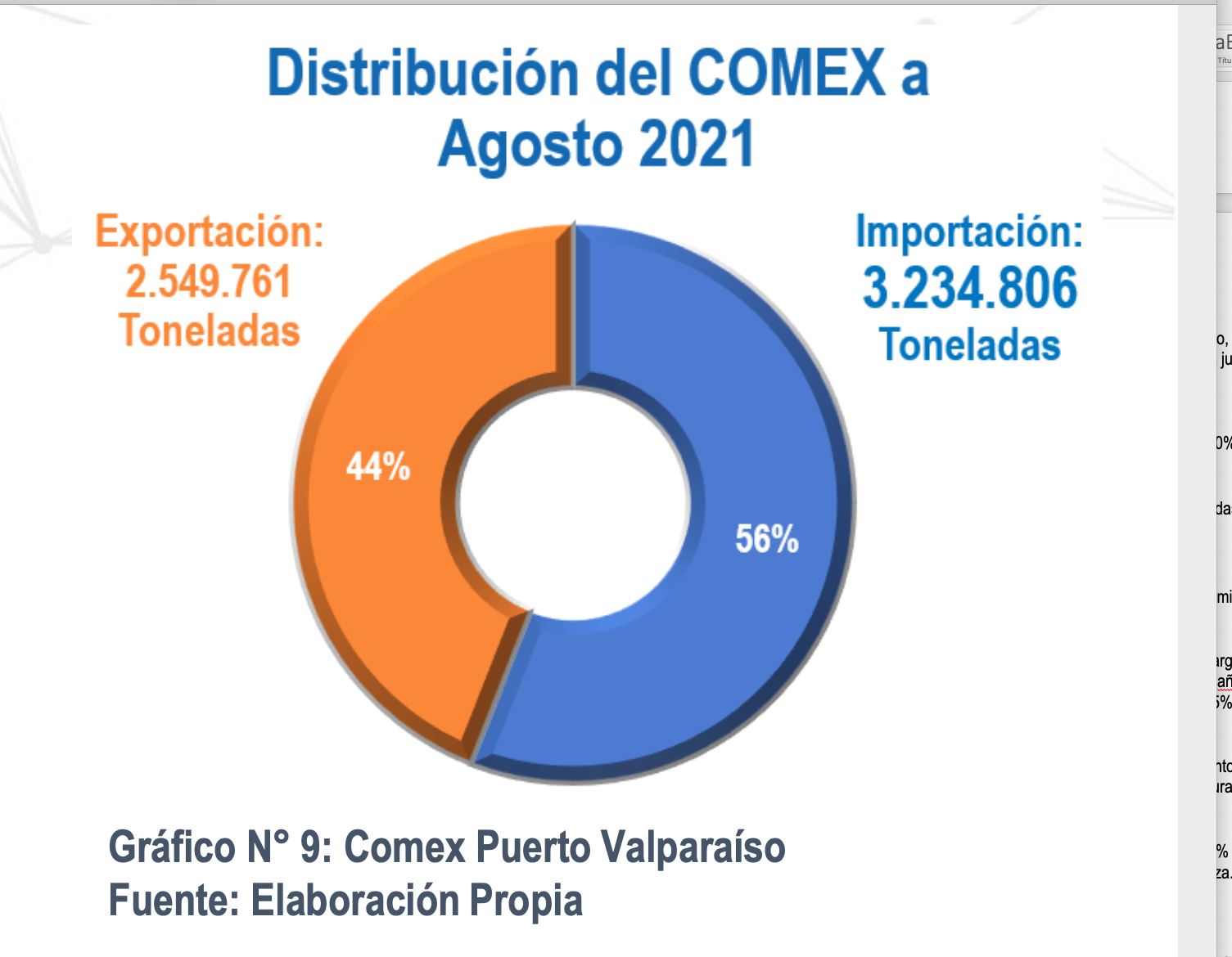 En cuanto a la distribución del Comex, las exportaciones son el 40,8% de los transferidos de agosto, con 306.517 toneladas. Esta cifra significó un alza de 13,9% y 3,5% en comparación a agosto 2020 y a julio 2021.